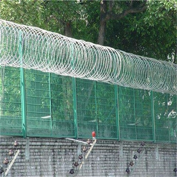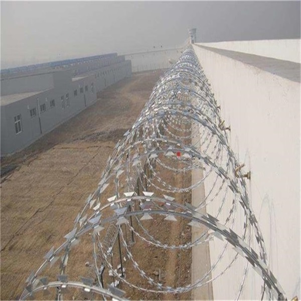 監(jiān)獄看守所蛇腹式刀刺網(wǎng)材料有中碳鋼絲、冷軋鍍鋅薄板,不銹鋼板,不銹鋼絲。蛇腹型刀片刺網(wǎng),上、下懸掛0.5米的交叉蛇腹型刀片刺網(wǎng),刀片刺網(wǎng)采用鋼板沖壓成型包附于鋼絲(筋絲)之上,由銳利尖角鋅鋼板或不銹鋼薄板做刀片,高張力鋼絲做芯線組合而成的。鋒利的刀型刺由雙線扣裝后成蛇腹?fàn)罴让烙^又讓人不寒而粟。起到了很好的阻嚇作用。刀片刺網(wǎng)硬度好,制造及特點(diǎn):鋼絲為芯絲,將沖壓好的刀片包裹在芯絲上,一次制成。產(chǎn)品具有很強(qiáng)的防護(hù)能力和恐嚇能力,安裝方便,壽命長。
