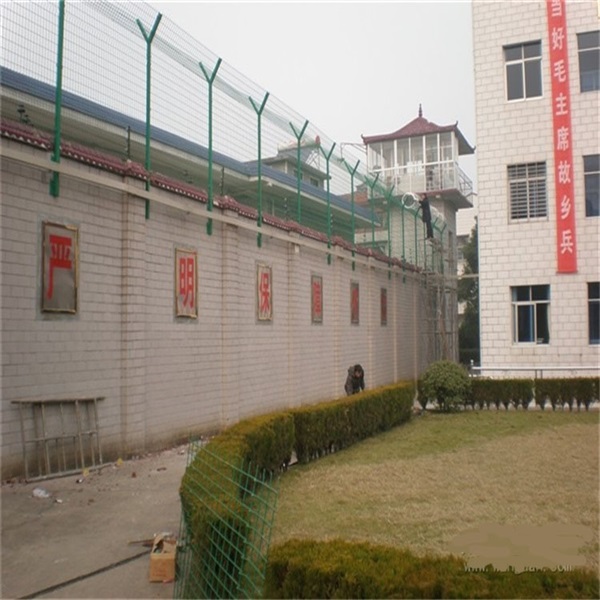 監(jiān)獄圍墻加高網(wǎng)通常采用鋼絲直徑為5mm、6mm、6,5mm,網(wǎng)孔采用50mm*100mm、50mm*50mm、50mm*200mm、50mm*150mm, 組成結(jié)構(gòu):首先把網(wǎng)片焊接在鐵管框架上,框架是方管或者圓管焊接成的框架結(jié)構(gòu),在框架上焊接用于個(gè)立柱連接的連接板,用防盜螺栓與立柱連接。為了保證網(wǎng)片的防拆卸性能,網(wǎng)片連接方式采用特制防盜緊扣件,有效防止人為的破壞性拆卸。