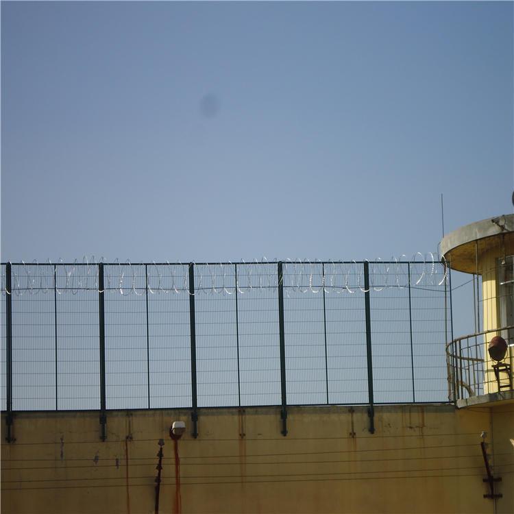 監(jiān)獄加高隔離網(wǎng)一般頂端都設(shè)有V型支架與立柱焊接。材料通常選擇和立柱同等材料或者稍小規(guī)格材料搭配使用。V型支架的加裝是為了將蛇腹形刀刺網(wǎng)固定在隔離網(wǎng)頂部,蛇腹形刀刺網(wǎng)有不銹鋼刀片刺繩、鍍鋅刀片刺繩,還有電泳刀片刺繩。從而有效的增加監(jiān)獄圍墻隔離網(wǎng)的防攀爬性和安全性。