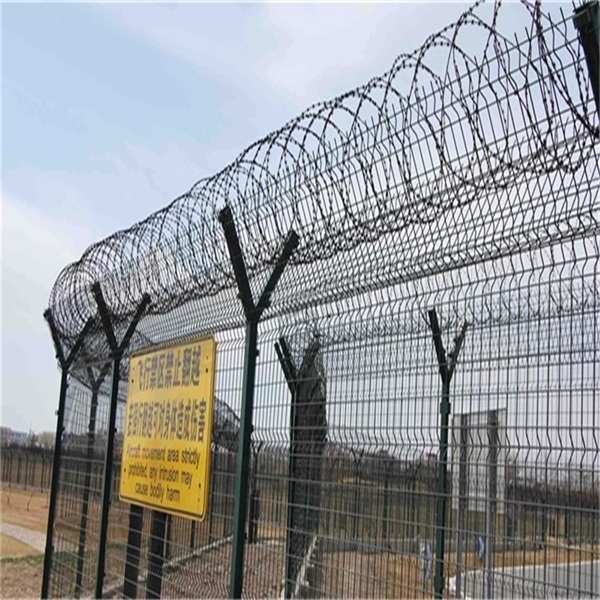 機場網(wǎng)圍界常見的規(guī)格:鋼筋網(wǎng)片一般為墨綠色,外形尺寸2*3m,網(wǎng)孔5*50cm,絲徑5mm,上端有V型支架用來固定刀刺滾籠,加強二次防護功能。機場圍界鐵絲網(wǎng)立柱采用80*60*6mm矩形鋼管,預埋0.5m左右,整體進行熱鍍鋅和熱浸塑處理,防腐功能強、使用壽命長,是使用量很廣泛的機場圍界樣式。機場圍界鐵絲網(wǎng)其他網(wǎng)孔具體尺寸可以根據(jù)客戶要求定做。