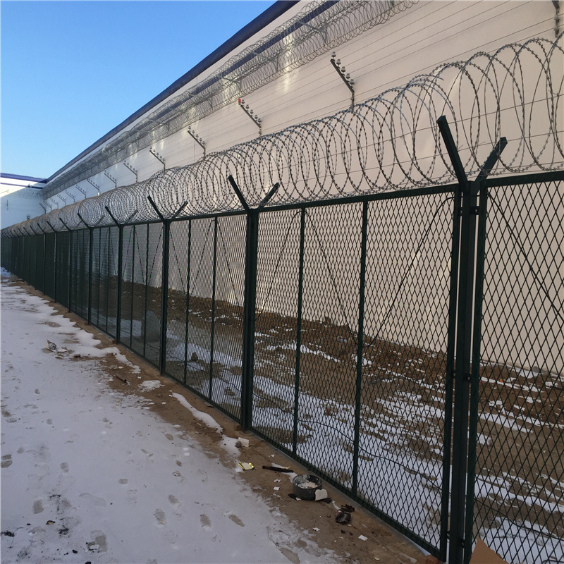 部隊(duì)訓(xùn)練基地圍欄網(wǎng)為了提高訓(xùn)練效率和質(zhì)量需要一個(gè)全封閉的場(chǎng)所。這種場(chǎng)區(qū)圍欄網(wǎng)需要措配使用蛇腹形刀刺網(wǎng)形成一段安全防御護(hù)網(wǎng)。下面的圍欄網(wǎng)使用強(qiáng)度好的鋼絲焊接,頂部再搭配刀刺網(wǎng)為軍人訓(xùn)練營(yíng)造一個(gè)好的封閉環(huán)境,是由V型支架立柱增強(qiáng)型焊接片網(wǎng),平安防匪件和熱鍍鋅刀片刺籠構(gòu)成強(qiáng)度和安全性級(jí)別很高,被遍及用于機(jī)場(chǎng),軍事等場(chǎng)所。因?yàn)榫哂袑庫(kù)o性高、防攀爬效果好,網(wǎng)片毗鄰特制SBS緊扣件, 有效防止人為的損壞性拆卸,橫向四道折彎增強(qiáng)筋,使網(wǎng)面強(qiáng)度明顯。