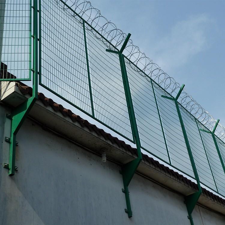 看守所加高圍墻刀刺網(wǎng) 圍墻防攀爬隔離網(wǎng)通常采用鋼絲直徑為5mm、6mm、6.5mm,網(wǎng)孔采用50mm*100mm、50mm*50mm、50mm*200mm、50mm*150mm,組成結(jié)構(gòu):把網(wǎng)片焊接在鐵管框架上,框架是方管或者圓管焊接成的框架結(jié)構(gòu),在框架上焊接用于個(gè)立柱連接的連接板,用防盜螺栓與立柱連接。為了網(wǎng)片的防拆卸性能,網(wǎng)片連接方式采用特制防盜緊扣件,有效防止人為的破壞性拆卸。
