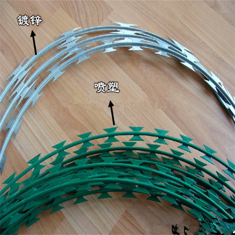 噴塑刀片刺絲滾籠由銳利尖角鍍鋅鋼板或不銹鋼薄板做刀片,高張力鋼絲做芯線組合而成的阻絕器材。由于刀片刺籠防護(hù)網(wǎng)造形獨(dú)特不易觸摸,因而能達(dá)到極好的防護(hù)隔離效果。直線形刀片刺網(wǎng)由刀片型直線刺網(wǎng)交叉焊接成型,可用于防盜窗、高速公路隔離網(wǎng)隔離柵。噴塑刺絲滾籠優(yōu)勢(shì)在原有的熱鍍鋅或者不銹鋼材質(zhì)基礎(chǔ)上噴涂,形成表面雙層防腐層,壽命更長(zhǎng),與護(hù)欄或周圍環(huán)境搭配,更美觀,施工迅速、效果顯著。