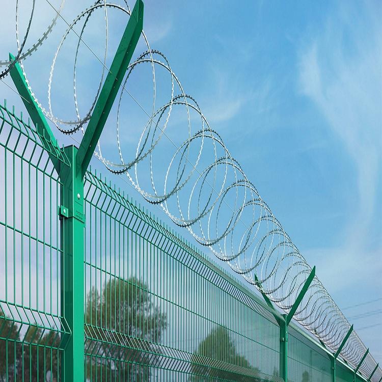 機(jī)場(chǎng)鋼筋網(wǎng)圍界浸塑:浸塑是將金屬構(gòu)件預(yù)熱后浸入流化狀態(tài)的塑料粉末中,以金屬構(gòu)件自身的熱量使粉末均勻沾附于 構(gòu)件表面,再進(jìn)一步加熱使粉末充分熔融流平,冷卻后金屬表面即形成平滑的塑層.塑層厚度0.8-1.2mm.浸塑防腐比較適用于潮濕,多雨的氣候.質(zhì)量好的浸塑產(chǎn)品使用壽命可達(dá)10年.