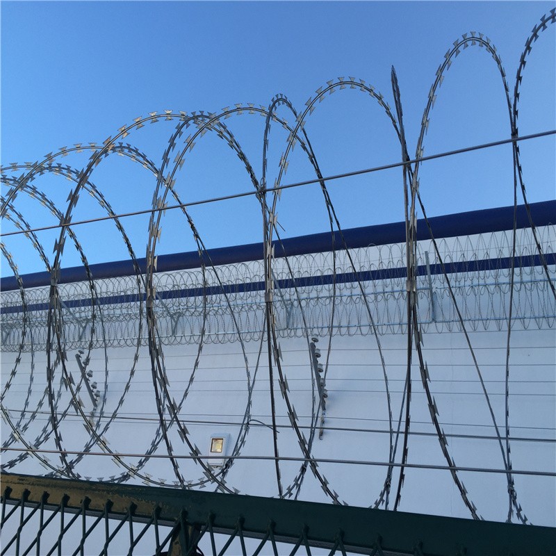 蛇腹形刀刺網(wǎng)利用”V”字型支架牽引的熱鍍鋅鋼絲在刀刺網(wǎng)圈內(nèi)進(jìn)行固定,牽引鋼絲數(shù)量不少于4根,刀刺網(wǎng)與鋼網(wǎng)墻網(wǎng)片間距不大于50mm。