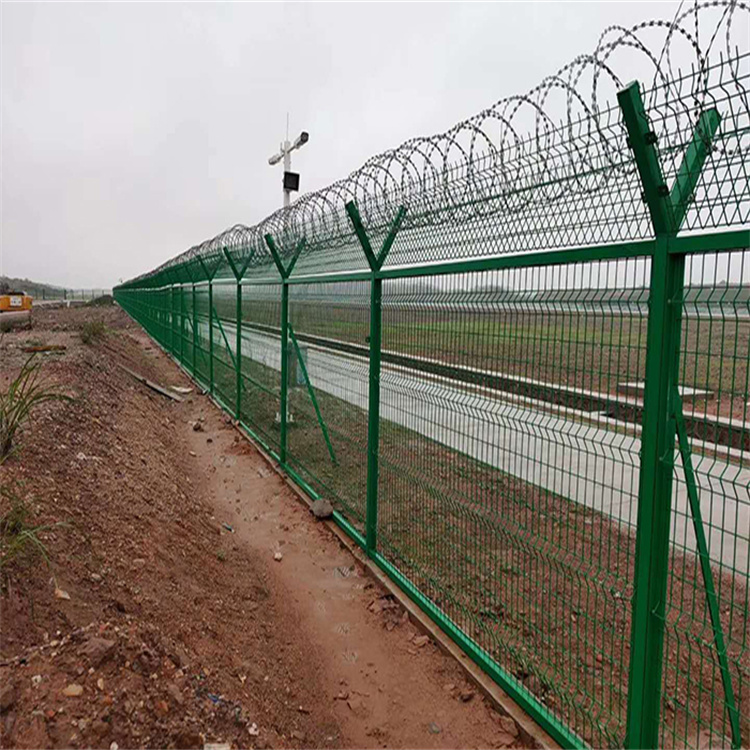 機(jī)場(chǎng)圍界護(hù)欄是飛機(jī)場(chǎng)重要的安全防護(hù)鐵絲網(wǎng),它是由Y型立柱、加強(qiáng)型折彎電焊網(wǎng)、安全防盜連接件、鍍鋅刀片刺繩等構(gòu)成的,常常被用于安全級(jí)別要求比較高的場(chǎng)所,如飛機(jī)場(chǎng)周邊圍界、監(jiān)獄看守所圍墻、私人領(lǐng)地、軍事邊防等領(lǐng)域。它不僅外形美觀,而且安全性高,由于防止人員攀爬翻越過(guò)邊界,所以機(jī)場(chǎng)圍界的上面掛著螺旋狀的刀片刺鐵絲,很容易劃傷人的皮膚,防護(hù)型很高。