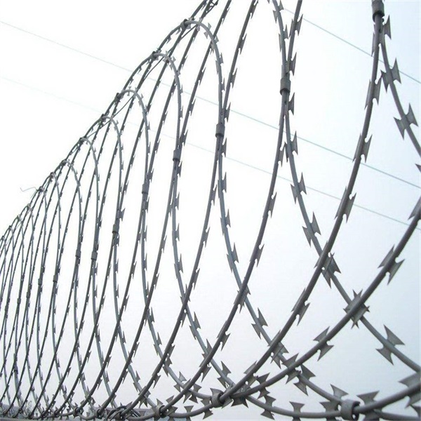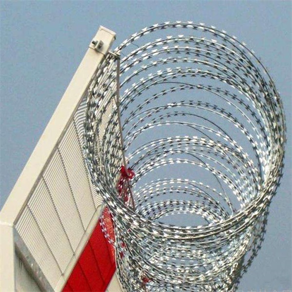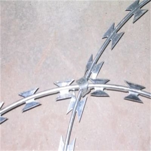 鋼絲做芯線組合而成的。鋒利的刀型刺由雙線扣裝后成蛇腹?fàn)?,既美觀又讓人不寒而栗?!銜?huì)搭配60mm方管,壁厚在2-2.5m,高度2.4米,底部2米圍直線,上部0.4米向內(nèi)折30度成斜線,立柱間隔為3米,橫粱采用40*2mn長(zhǎng)方鋼,長(zhǎng)3米為一個(gè)單位,菱形孔刀片刺網(wǎng)和螺旅狀刀刺網(wǎng)組成完美的鋼網(wǎng)圍墻。