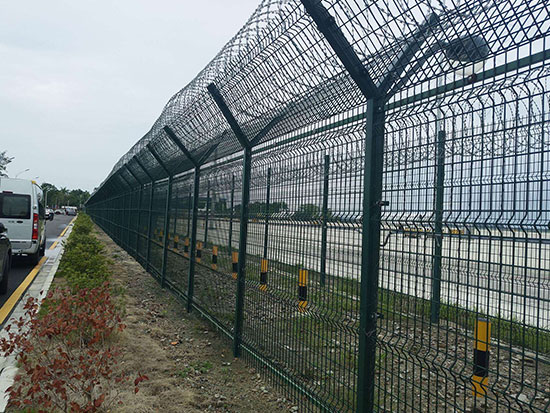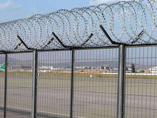 機(jī)場(chǎng)圍界網(wǎng)頂部加裝刀片刺絲、刀片刺網(wǎng)后又很好的增強(qiáng)了安全防護(hù)性能。其產(chǎn)品造型美觀、花色多樣,既起到圍欄作用,又起到美化作用。由于具有安全性高、防攀爬能力好,網(wǎng)片連接方式采用特制SBS緊扣件,有效防止人為的破壞性拆卸,橫向四道折彎加強(qiáng)筋,使網(wǎng)面強(qiáng)度顯著增加。