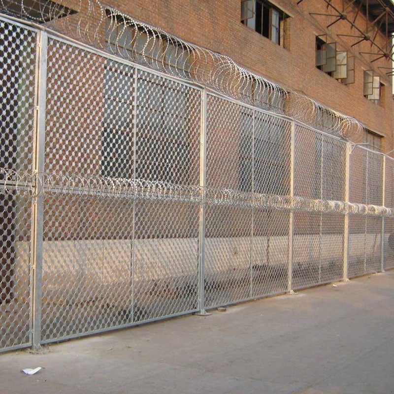 還有一些地方則采用刺繩圍欄,立柱和上面講的一樣,但是采用的是刺繩或者刀片刺網(wǎng)的形式。但一般用于監(jiān)護(hù)部門。下面用圖片來表示更能一目了然。監(jiān)獄護(hù)欄網(wǎng)用作圍墻增高網(wǎng)式,樣式一般上班要就刀刺滾籠,圍網(wǎng)也要求的比一般的要防攀爬,我?guī)Т蠹铱纯锤鞣N樣式監(jiān)獄護(hù)欄網(wǎng)的圍墻加高網(wǎng)。