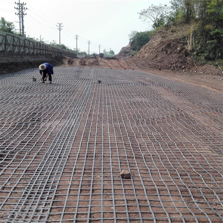 鋼塑土工格柵以高強(qiáng)鋼絲(或其他纖維),經(jīng)特殊處理,與聚乙烯(PE),并添加其他助劑,通過擠出使之成為復(fù)合型高強(qiáng)抗拉條帶,且表面有粗糙壓紋,則為高強(qiáng)加筋土工帶。由此單帶,經(jīng)縱、橫按一定間距編制或夾合排列,采用特殊強(qiáng)化粘接的熔焊技術(shù)焊接其交接點(diǎn)而成型,則為加筋土工格柵。