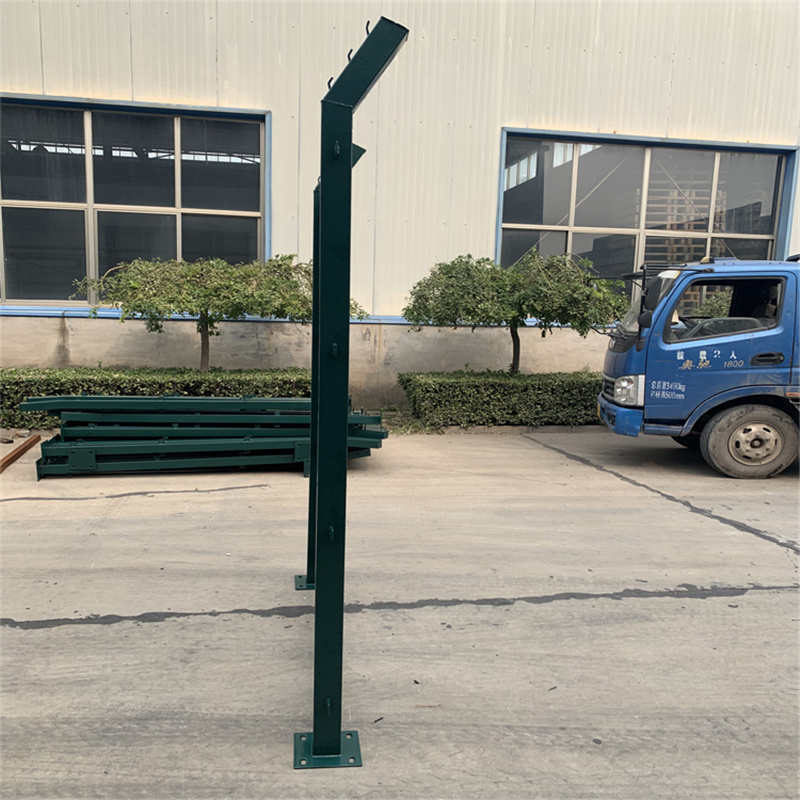 二,方管立柱,這個(gè)應(yīng)該也是比較常見的一種立柱。方管立柱與道路護(hù)欄網(wǎng)片的鏈接方式也是通過‘耳朵’鏈接。也有部分使用者為適應(yīng)起伏不定的地形環(huán)境,通過立柱上的耳朵與框架護(hù)欄網(wǎng)的框架任意位置打孔鏈接。