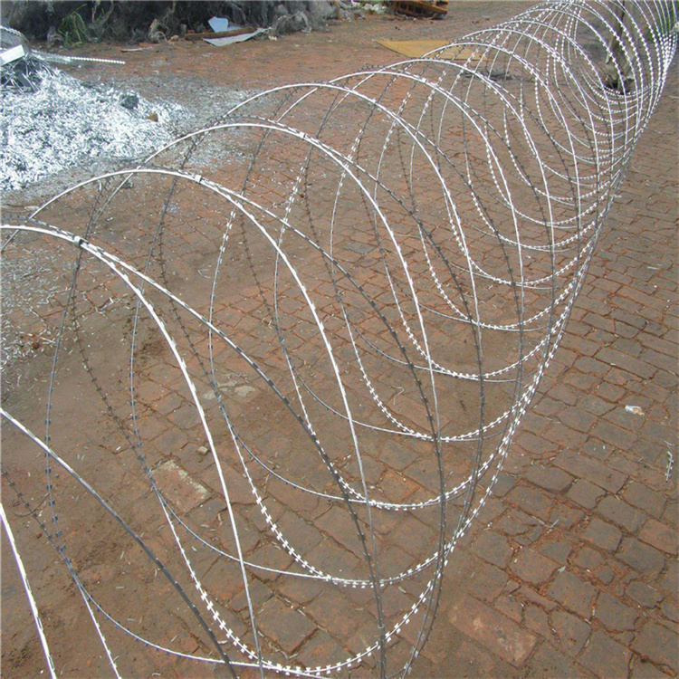 1、單獨(dú)使用時(shí):主要是與混凝土實(shí)體墻結(jié)合使用,有專(zhuān)門(mén)配套的V型或者Y型支架,底部焊有法蘭盤(pán)打膨脹螺絲與墻體固定。支架上焊接鐵絲小勾卡槽用來(lái)固定鍍鋅絲,鍍鋅絲的作用是用來(lái)承托起蛇腹型刀刺,那U型卡扣與蛇腹型刺絲滾籠相連。因?yàn)槊總€(gè)支架的間距為2.5--3米,這中間如果沒(méi)有鍍鋅絲,刺絲滾籠會(huì)下垂,達(dá)不到理想安裝效果。