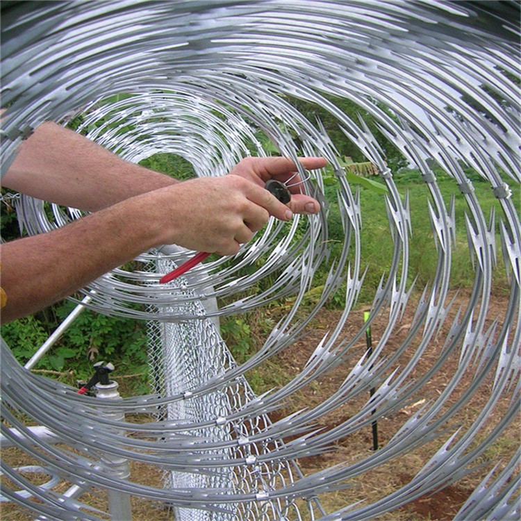 滾刀網(wǎng)V型支架底部焊用法蘭打脹大螺絲與墻面固定不變。鍍鋅鋼帶的實(shí)際效果是用來(lái)襯托起銳蛇型刀刺,那U型扣鎖與銳蛇型刺絲滾籠相連。因?yàn)槊恳粋€(gè)固定支架的間距為2.5--3米,這中間如果沒(méi)有鍍鋅鋼帶,它會(huì)松,達(dá)不了理性化裝置預(yù)期效果。