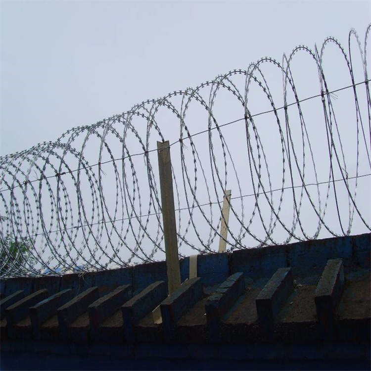 (4)支架在圍墻上的固定方法一般為底盤(pán)打膨脹螺絲固定。固定好后,方可進(jìn)行蛇腹形刀刺網(wǎng)安裝。