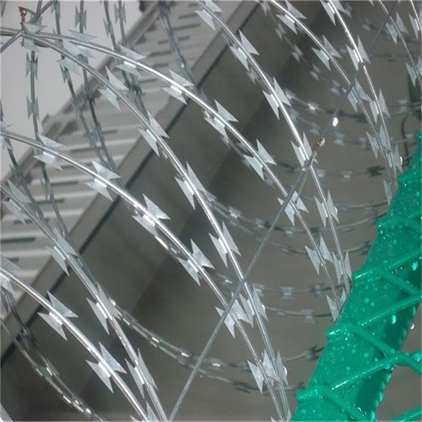 監(jiān)獄用的不銹鋼蛇腹型刀刺網(wǎng)一般選用304材質的,防腐壽命長,免于像熱鍍鋅刀刺網(wǎng)需要勤更換的麻煩了。不銹鋼刀刺網(wǎng)直徑,常用500mm,600mm,排列密度不小于10圈/m,相鄰每圈間距不大于100mm;刀刺網(wǎng)刀片為304不銹鋼板沖壓的尖銳菱形,長度22mm,寬度15mm,厚度0.5mm;芯線為不銹鋼絲,線徑不小于2.5mm,刀刺網(wǎng)與V型托架采用3道固定拉絲均勻固定,,扎絲采用1.2mm304不銹鋼絲,固定拉絲采用8號鍍鋅鐵絲。